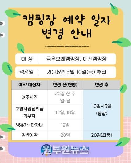 (원투원뉴스) 여주도시공사는 오는 5월 10일부터 이용자 중심의 고품질 서비스 제공을 위해 금은모래캠핑장, 대신캠핑장의 온라인 통합예약 일정을 대폭 간소화한다고 밝혔다.
