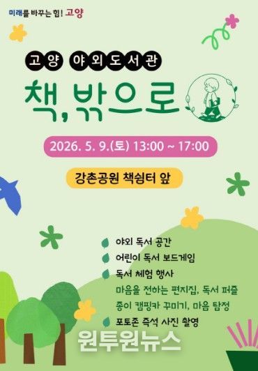 (원투원뉴스) 고양특례시는 오는 5월 9일 오후 1시부터 5시까지 일산동구 강촌공원 책쉼터 앞에서 고양 야외도서관 ‘책, 밖으로’를 운영한다.