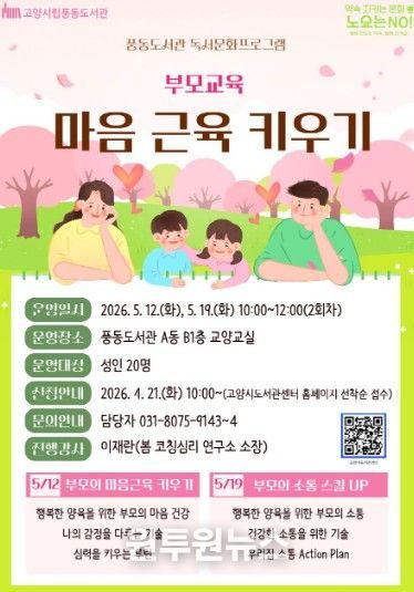 (원투원뉴스) 고양특례시 풍동도서관은 오는 5월 독서문화 프로그램 ‘부모교육, 마음 근육 키우기’를 진행한다고 22일 밝혔다.