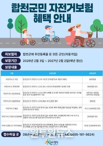 (원투원뉴스) 합천군은 군민들의 자전거 이용 활성화와 안전사고에 대비하기 위해 ‘2026년 합천군민 자전거 단체보험’에 가입했다고 22일 밝혔다.