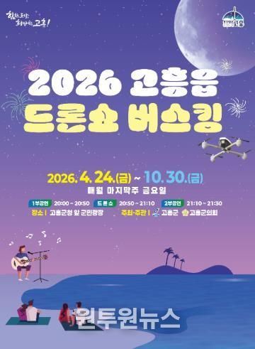 (원투원뉴스) 고흥군은 ‘2026 고흥읍 드론쇼 버스킹 공연’을 오는 4월 24일부터 10월 24일까지 7개월간 매월 마지막 주 금요일 고흥군청 앞 군민광장에서 개최한다고 밝혔다.