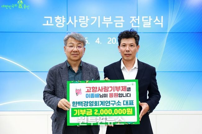 (원투원뉴스) 한백경영회계연구소 이종배 대표가 지난 4월 20일 울진군에 고향사랑기부금 200만 원을 전달했다.