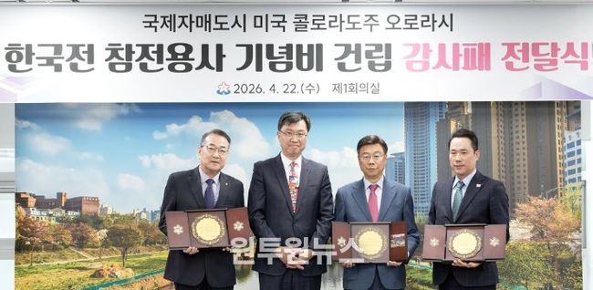 (원투원뉴스) 성남시가 22일 오후 2시 미국 콜로라도주 오로라시의 ‘한국전 참전용사 기념비’ 건립에 기여한 공로를 인정받아 오로라시 한국전참전용사기념비건립위원회로부터 감사패를 받았다.