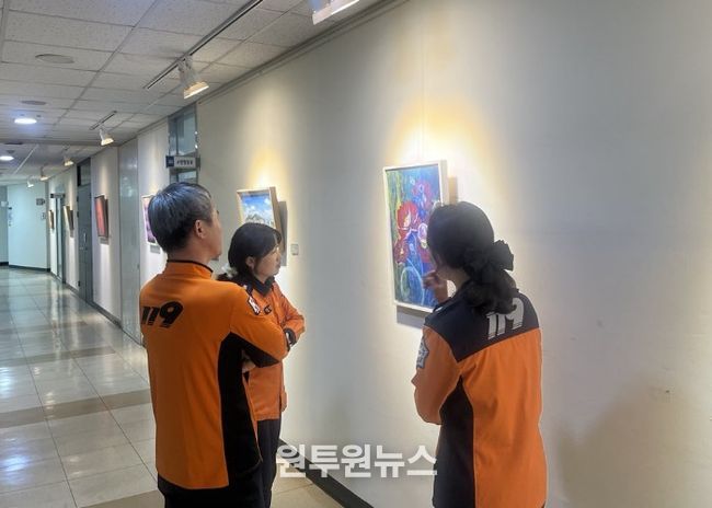 (원투원뉴스) 광명소방서는 소방공무원의 직무스트레스 해소와 정서적 안정을 위해 본서 2층 복도에 ‘복도에서 만나는 여유’ 미술갤러리를 운영하고 있다. 직원들이 일상 속에서 예술작품을 접하며 심리적 안정을 얻을 수 있도록 마련됐다.