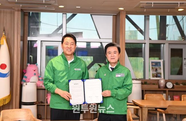 김태흠 충남도지사는 22일 서울시장 집무실에서 오세훈 시장과 ‘태안국제원예치유박람회(태안박람회)와 서울국제정원박람회(서울박람회) 성공 개최를 위한 업무협약’을 체결했다.