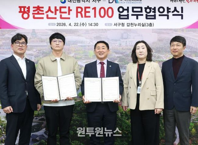 (원투원뉴스) 대전 서구는 22일 구청 갑천누리실에서 평촌일반산업단지 입주기업인 ㈜닥스엔지니어링과 재생에너지 보급 확산을 위한 ‘RE100 업무협약’을 체결했다.