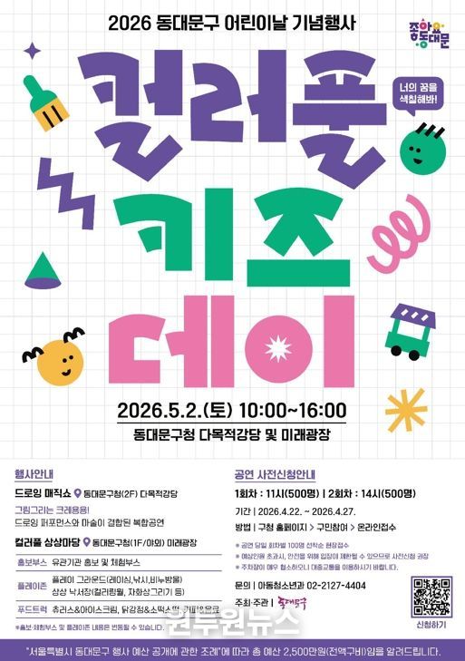 먼저 어린이날을 기념해 5월 2일 동대문구청 2층 다목적강당 및 1층 미래광장에서 2026년 어린이날 기념행사 '컬러풀 키즈데이'를 개최한다.