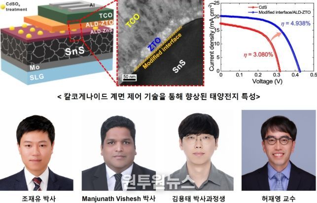 (원투원뉴스) 전남대학교 연구진이 친환경 소재로 주목받아온 황화주석(SnS) 태양전지의 최대 약점이었던 효율 한계를 계면 제어 기술로 극복하며, 상용화 가능성을 한 단계 끌어올렸다.
