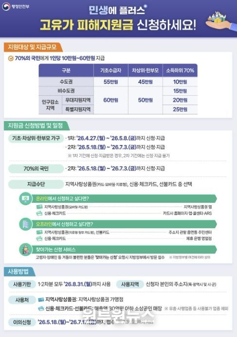 (원투원뉴스) 청주시는 고유가·고물가로 인한 시민 부담을 완화하고 지역 경제 회복을 지원하기 위해 오는 27일부터 ‘고유가 피해지원금’ 1차 신청·지급을 개시한다고 밝혔다.