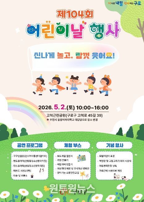 (원투원뉴스) 구로구가 제104회 어린이날을 맞아 오는 5월 2일 고척근린공원에서 어린이와 가족, 지역주민이 함께 즐길 수 있는 ‘어린이날 행사’를 개최한다.