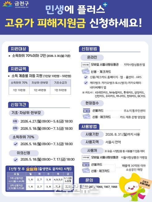 (원투원뉴스) 금천구는 중동 정세 불안 등으로 촉발된 고유가·고환율·고물가 상황에서 구민의 생활 부담을 완화하고 지역경제를 활성화하기 위해 오는 27일부터 ‘1차 고유가 피해지원금’ 신청 접수 및 지급을 시작한다고 밝혔다.