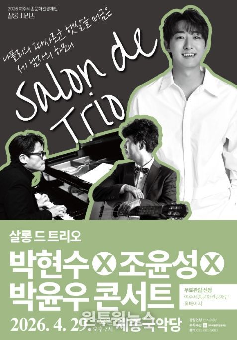(원투원뉴스) 여주세종문화관광재단이 오는 29일, 문화가 있는 날을 맞아 2026년 특별기획 살롱 시리즈의 세 번째 무대 '살롱 드 트리오 박현수X조윤성X박윤우 콘서트'를 세종국악당에서 개최한다.