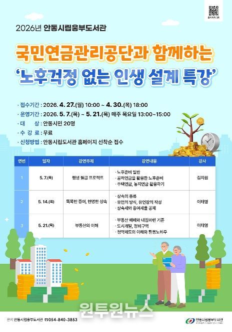(원투원뉴스) 안동시립웅부도서관은 지역 주민들에게 건강하고 안정적인 노후생활을 지원하기 위해 부동산, 연금, 상속 등 행복한 노후 설계의 핵심 노하우를 전하는 ‘노후 걱정 없는 인생 설계’ 특강을 운영한다고 23일 밝혔다.