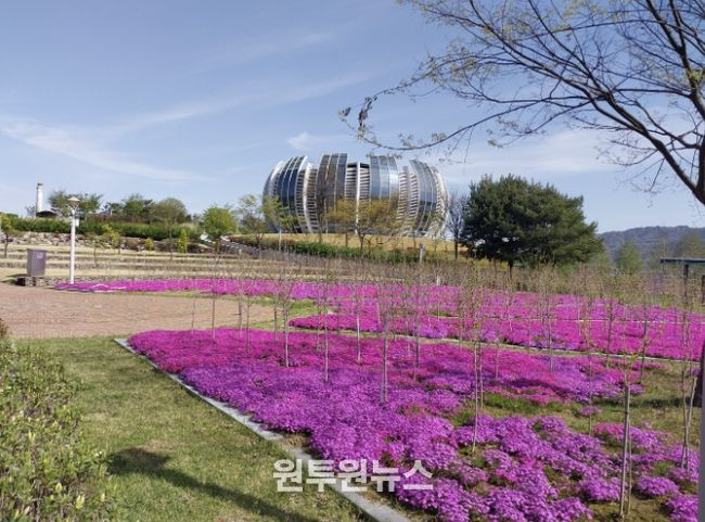 (원투원뉴스) 상주시민의 힐링 휴식처인 중덕지 자연생태공원에 봄 향기를 가득 머금은 꽃잔디가 만개해 눈부신 보라색 빛을 발산하고 있다.