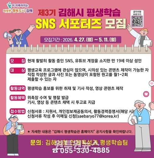 백쌍미 김해시 인재육성과장은 “SNS 서포터즈는 시민이 참여해 평생학습 현장을 알리는 중요한 역할을 한다”며 “참신한 아이디어와 열정을 가진 시민들의 많은 관심과 참여를 바란다”고 말했다.