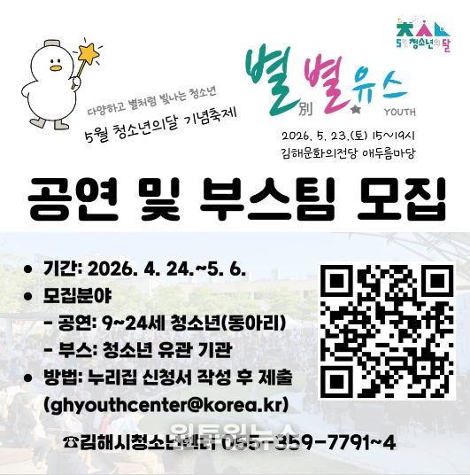 (원투원뉴스) 김해시청소년센터는 청소년이 직접 기획하고 참여하는 2026년 청소년의 달 기념 축제 ‘별별유스’를 앞두고 공연 및 체험 부스 참가팀 모집에 나섰다고 밝혔다.