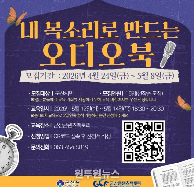 오디오북 제작에 관심 있는 군산시민(성인)이라면 누구나 참여할 수 있으며, 신청은 4월 24일부터 5월 8일까지 군산시청 또는 군산콘텐츠팩토리 홈페이지에 게시된 QR코드를 통해 접수할 수 있다. 모집 인원은 15명으로, 선착순 마감된다.