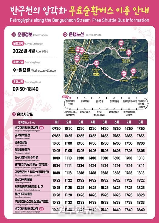 운행 시간표는 암각화박물관 등 주요 거점 안내 표지판과 울산시 공식 누리소통망(SNS)을 통해 확인할 수 있다.