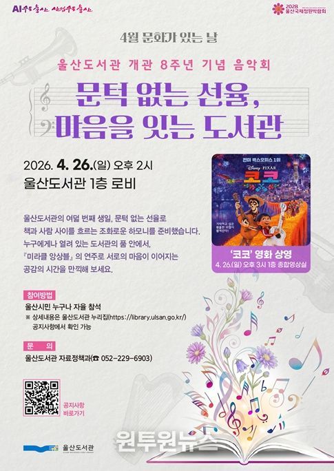 (원투원뉴스) 울산도서관은 오는 4월 26일 오후 2시 도서관 1층 로비에서 개관 8주년을 맞아 4월 문화가 있는 날의 일환으로 ‘문턱 없는 선율, 마음을 잇는 도서관’ 음악회를 개최한다고 밝혔다.