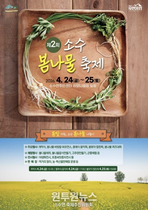(원투원뉴스) 충북 괴산군 소수면축제추진위원회는 오는 24일부터 25일까지 이틀간 소수면 하모니광장 일원에서 ‘제2회 소수봄나물축제’를 연다.