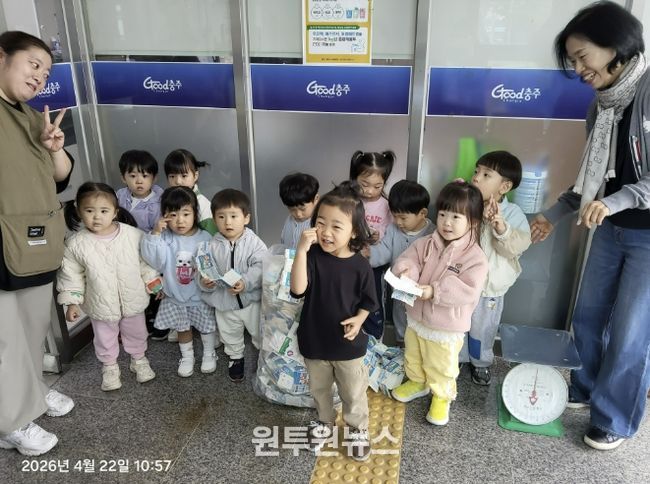 (원투원뉴스) 충주시 대소원면 소재 코아키즈어린이집 원생들이 22일 자원 재순환의 가치를 실천하기 위해 대소원면행정복지센터를 방문했다.