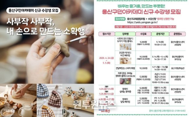 ‘용산구민아카데미 2기’는 도자기, 코바늘 등 다양한 분야의 강좌로 구성됐다. 특히 구민들이 일상에서 바로 활용할 수 있도록 체험 중심 프로그램을 강화하고, 단기 체험형 일일 강좌와 정규 강좌를 함께 운영해 다양한 학습 수요를 반영한 점이 특징이다.