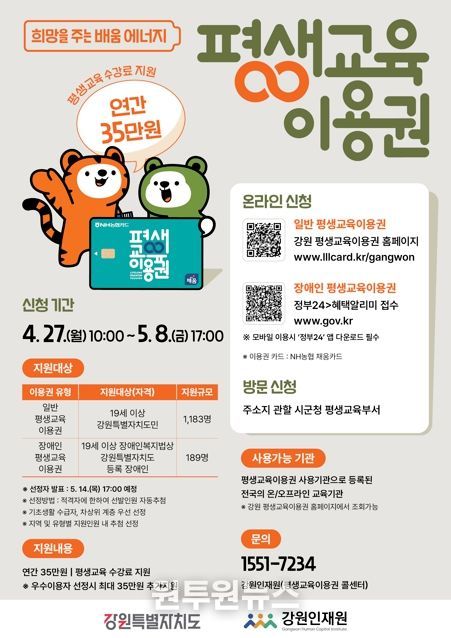 (원투원뉴스) 홍천군이 경제적 여건에 따른 교육 격차를 줄이고 평생교육 소외계층 성인의 자아실현을 돕기 위해 ‘2026년 강원특별자치도 평생교육이용권 2차 신청’을 4월 27일부터 5월 8일까지 받는다.