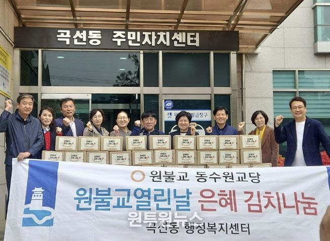 (원투원뉴스) 원불교 동수원교당은 지난 22일 수원시 권선구 곡선동 행정복지센터에서 봄맞이 ‘은혜김치 나눔’ 전달 행사를 개최하고, 정성껏 담근 김치 30박스를 곡선동에 전달했다.