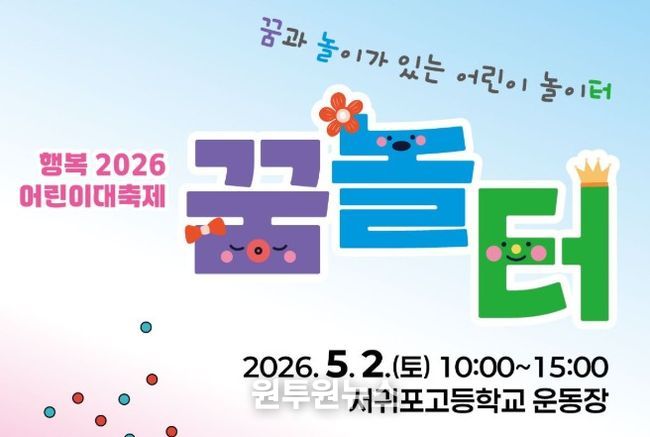 (원투원뉴스) 서귀포시교육지원청은 5월 2일 오전 10시부터 오후 3시까지 서귀포고등학교 운동장에서 제104회 어린이날을 기념해 ‘행복 2026 어린이대축제’를 개최한다.