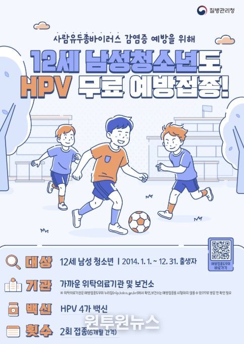 기존에는 여성청소년과 일부 저소득층 여성에게 제공되던 무료 접종이 12세 남성 청소년(2014년생) 대상으로 총 2회(6개월 간격) 무료 접종을 시작한다.