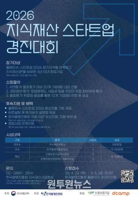 (원투원뉴스) 지식재산처는 신용보증기금, 은행권청년창업재단(디캠프), 한국발명진흥회와 함께 4월 23일 ~ 6월 5일까지'2026 지식재산 스타트업 경진대회'참가기업을 모집한다고 밝혔다.