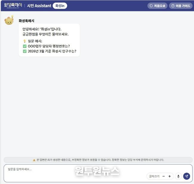(원투원뉴스) 화성특례시는 시민 체감형 행정서비스 강화를 위해 23일부터 ChatGPT 기반 대화형 AI 검색 서비스 ‘화성in’을 정식 운영한다.