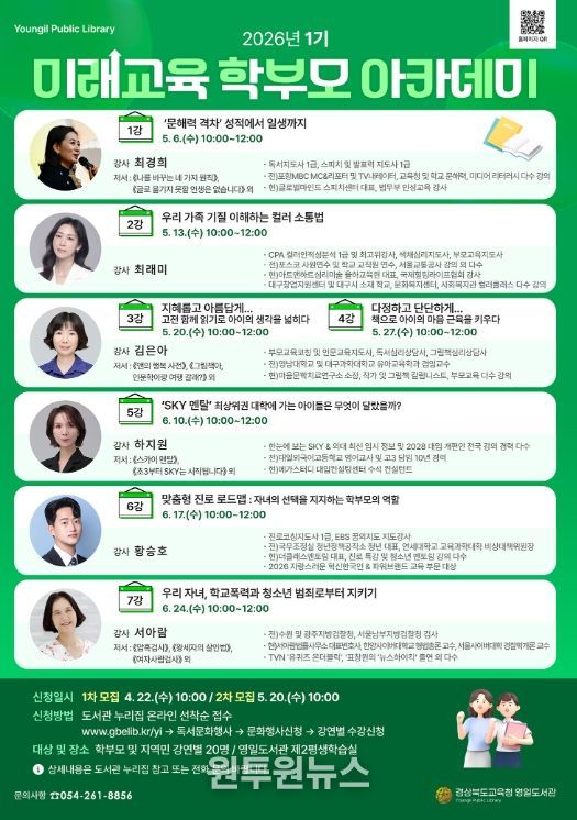 (원투원뉴스) 경상북도교육청 영일도서관은 오는 5월 6일부터 학부모 및 지역주민을 대상으로 ‘2026 1기 미래교육 학부모 아카데미’를 운영하고 수강생을 모집한다.