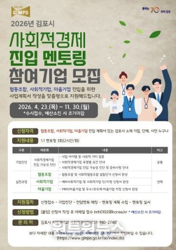 (원투원뉴스) 김포시는 협동조합, 사회적기업, 마을기업 등 사회적경제기업 진입을 지원하기 위해 ‘2026년 김포시 사회적경제 진입 멘토링’ 참여기업을 오는 11월 30일까지 수시 모집한다.
