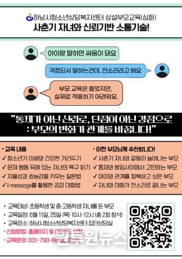 (원투원뉴스) 하남시 청소년상담 복지센터가 부모와 자녀 간 소통을 돕기 위한 부모교육 프로그램을 한층 강화한다. 특히 청소년기 자녀와의 대화에 어려움을 느끼는 부모들이 실제로 체감할 수 있는 교육으로 개편한 것이 특징이다.