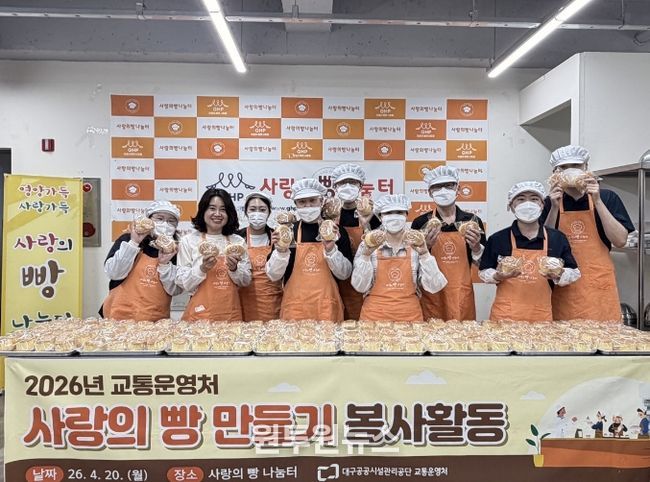 (원투원뉴스) 대구공공시설관리공단 교통운영처는 지난 4월 20일 지역 내 소외된 독거노인을 위한 ‘사랑의 빵 만들기’를 실시하여 샬롬재가노인돌봄센터에 기부하며 이웃사랑을 실천했다.