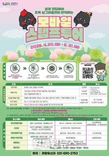 (원투원뉴스) 남양주시는 역사·힐링·건강·체험을 결합한 ‘2026년 상반기 모바일 스탬프투어’를 오는 6월 21일까지 운영한다고 23일 밝혔다.
