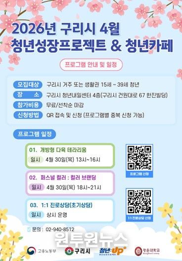이번 4월 프로그램은 구리시에 거주하거나 생활권을 둔 15세부터 39세까지의 청년을 대상으로 하며, 구리시 청년내일센터 4층에서 진행된다. 참가비는 무료이며 프로그램별 중복 신청이 가능하다. 다만 모집은 선착순으로 마감된다.