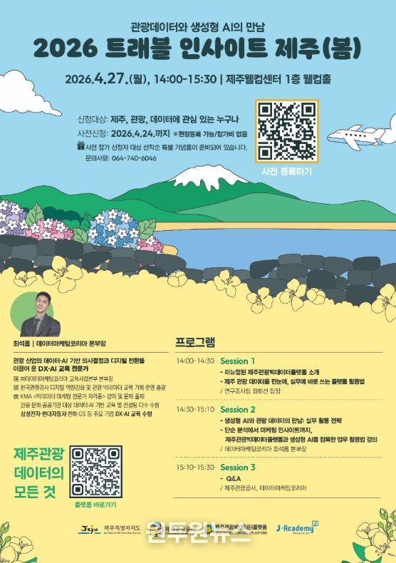(원투원뉴스) 제주특별자치도와 제주관광공사(사장 고승철)는 오는 27일 제주웰컴센터에서 관광사업체, 공공기관, 학계 등 관광과 데이터에 관심 있는 분들을 대상으로 데이터 기반 의사결정을 지원하기 위한 ‘2026 트래블 인사이트 제주(봄)’ 세미나를 개최한다고 23일 밝혔다. 이번 세미나에선 새롭게 개편한 제주관광 빅데이터 플랫폼(data.ijto.or.kr)의 활용 방안을 소개하고, 생성형 인공지능(AI)과 관광데이터를 결합한 실무 활용 전략을 공유한다.