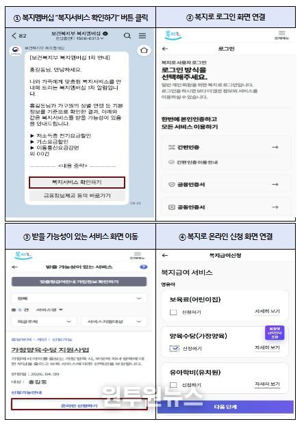 앞으로는 안내 문자 하단의 “복지서비스 확인하기” 버튼을 클릭하면 안내받은 복지서비스를 곧바로 온라인으로 신청*할 수 있어 안내부터 신청까지 한 번에 처리할 수 있게 됐다.