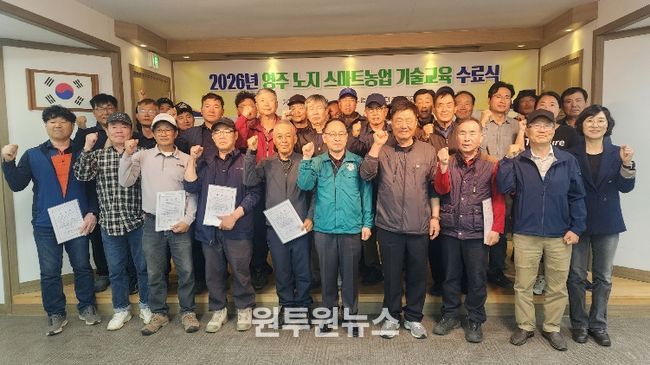 (원투원뉴스) 영주시농업기술센터는 지난 23일 농업체험교육관에서 교육생과 관계자 등 36명이 참석한 가운데 ‘영주 노지 스마트농업 기술교육’ 수료식을 개최했다.