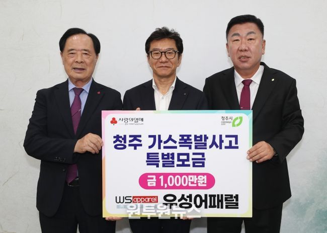 23일 ㈜우성어패럴은 청주시청을 방문해 봉명동 상가 가스폭발 사고로 피해를 입은 주민들을 돕기 위해 성금 1,000만원을 충북사회복지공동모금회를 통해 기탁했다.
