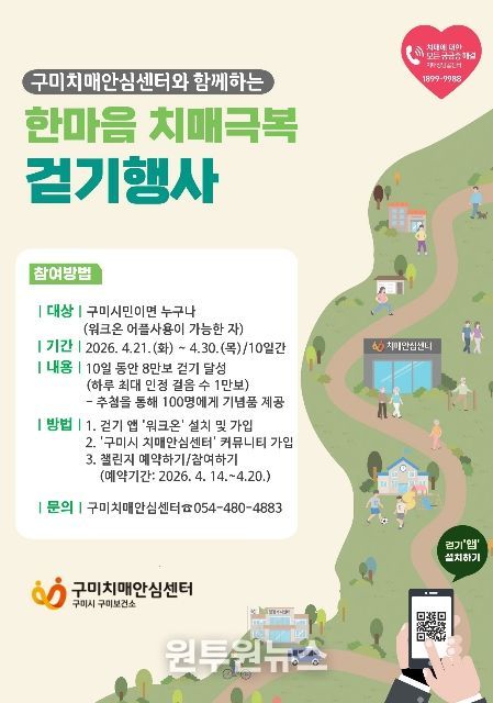 (원투원뉴스) 구미시는 치매 예방과 시민 건강 증진을 위해‘2026년 한마음 치매극복 걷기 챌린지’를 운영한다. 이번 챌린지는 시민 누구나 참여할 수 있는 비대면 걷기 프로그램으로 진행된다.