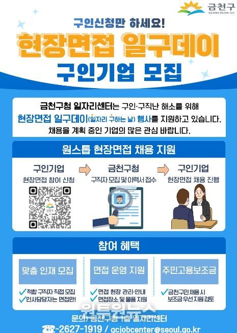 (원투원뉴스) 금천구는 구인·구직난을 해소하고, 기업의 원활한 채용을 지원하기 위해 ‘현장면접 일구데이’ 참여 기업을 상시 모집한다고 밝혔다.