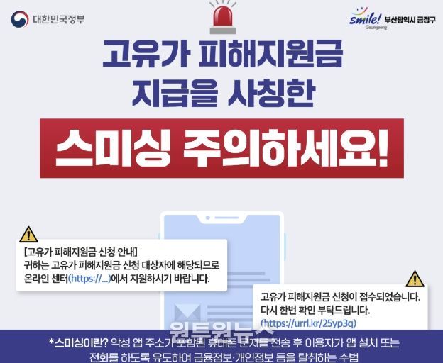 (원투원뉴스) 부산 금정구는 오는 4월 27일부터 ‘고유가 피해지원금’ 지급이 시작됨에 따라 이를 사칭한 스미싱(문자 결제 사기) 피해 예방을 위해 구민들에게 각별한 주의를 당부한다고 23일 밝혔다.