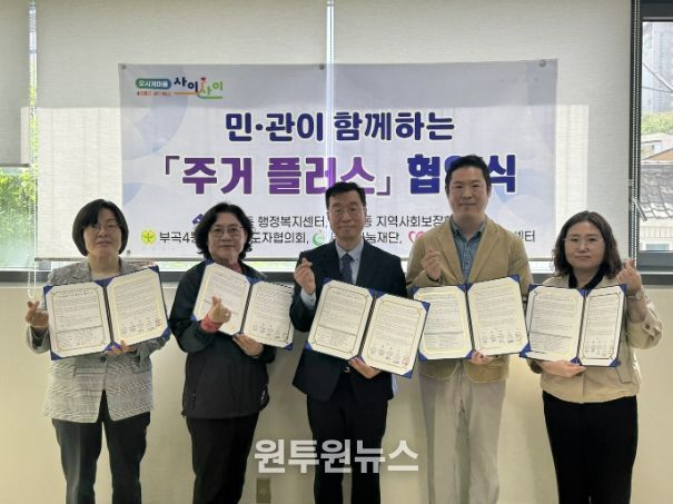 (원투원뉴스) 부산 금정구 부곡4동은 지난 4월 21일 세정나눔재단, 금정구 자원봉사센터, 부곡4동 지역사회보장협의체, 부곡4동 새마을지도자협의회와 함께 『민관협력 주거 플러스』 사업 추진을 위한 업무협약을 체결했다.