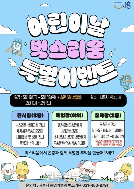 (원투원뉴스) 시흥시 곤충체험전시관 ‘벅스리움’은 어린이날을 맞아 아동과 가족이 함께 즐길 수 있는 ‘특별 프로그램’을 오는 5월 1일부터 5일까지 운영한다.