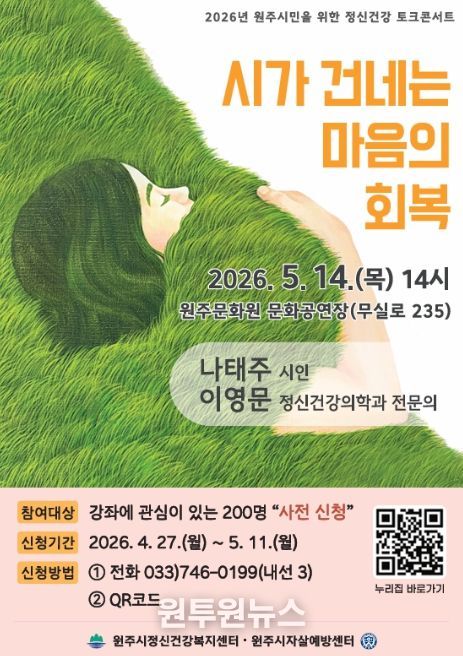 (원투원뉴스) 원주시정신건강복지센터는 다음 달 14일 원주문화원 문화공연장에서 ‘시가 건네는 마음의 회복’을 주제로 정신건강 토크콘서트를 개최한다.