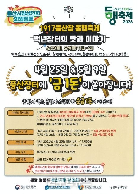 안동시 관계자는 “1917년부터 지역 경제의 중심 역할을 해온 풍산시장의 매력을 널리 알리고자 이번 축제를 기획했다”며, “맛있는 먹거리와 즐거운 쇼핑, 그리고 순금의 행운까지 함께하는 풍산장터에서 백년 장터의 깊은 맛과 이야기를 만끽하시길 바란다”고 전했다.