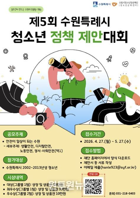 (원투원뉴스) 수원시청소년청년재단 수원청소년문화센터는 청소년이 정책을 기획하고 제안하는 ‘제5회 수원특례시 청소년 정책 제안대회’ 참가팀을 4월 27일부터 5월 27일까지 모집한다.